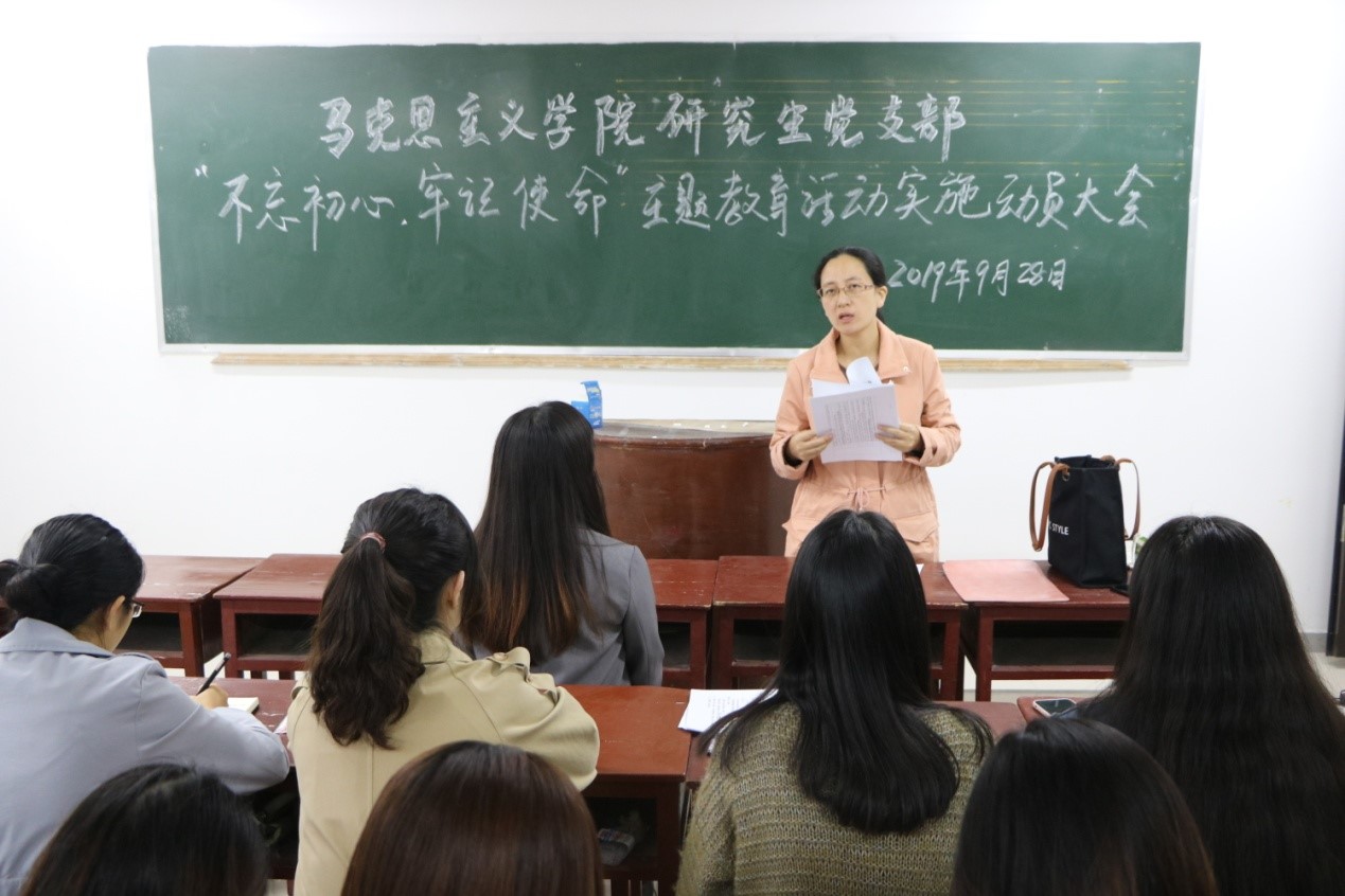9月28日下午,我院研究生党支部在教五楼201教室召开“不忘初心,牢记使命”主题教育活动实施方案动员大会,全体研究生党员和入党积极分子参加大会。会议由研究生党支部书记卢云晓主持。