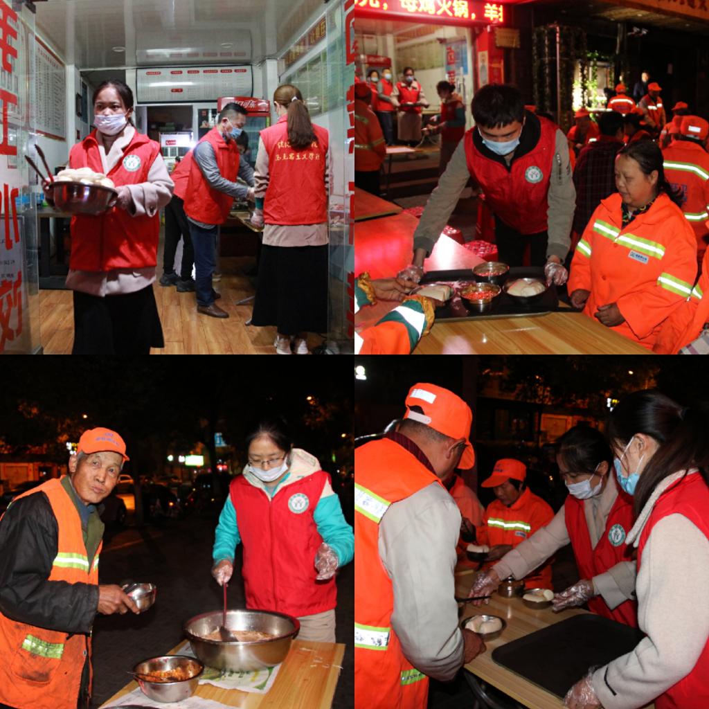 凌晨3:30,第一组志愿者们已经起床,4时整就在学校南门集合好,整装待发。此时的信阳,寒气逼人。但到达服务点后的激动逐渐驱散了寒意。在服务站负责人马阿姨的分工安排下,志愿小组便开始了备餐工作,整理碗筷,摆放桌椅……一切准备就绪。5时左右,陆续有环卫工人前来就餐,志愿者们穿梭于各个餐桌之间,为他们盛上一碗碗热腾腾的米粥,送上一盘盘香喷喷的小菜,奉上一个个松软可口的馒头,每个人都在有条不紊的忙碌着,尽力让每一位环卫工人都能尽早地在这样寒冷的清晨吃上热乎乎的饭菜。“志愿者无论做什么,我们都觉得好吃,因为这里面包含着爱心,我们心里只有感谢二字!”听着朴素的话语和肯定,大家都很高兴,一声简单的“谢谢”“这是我们应该做的”一扫清晨的寒冷和初次尝试的紧张。早餐结束后,环卫工人们开始投入工作,志愿小组协助义工们收拾好餐具和桌椅,细致地打扫好粥屋卫生,带着满满的幸福感结束了早上的服务工作。