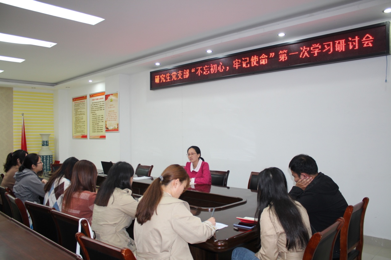 为提高党员政治觉悟,强化党员责任意识,10月29日下午,我院研究生党支部在社科楼323会议室开展了“不忘初心、牢记使命”主题教育第一次学习交流会,支部全体党员参加会议。会议由支部书记卢云晓主持。