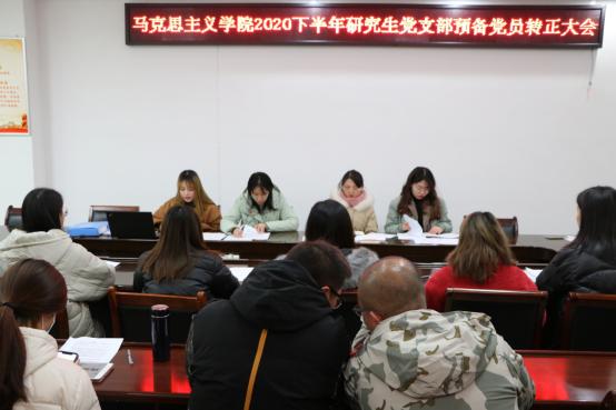 12月7日下午,我院研究生党支部于社科楼323会议室召开预备党员转正大会,讨论了预备党员张英、黄士家、董梓茜三位同志的转正问题。会议由支部副书记刘润博主持,支部全体党员参加了会议。