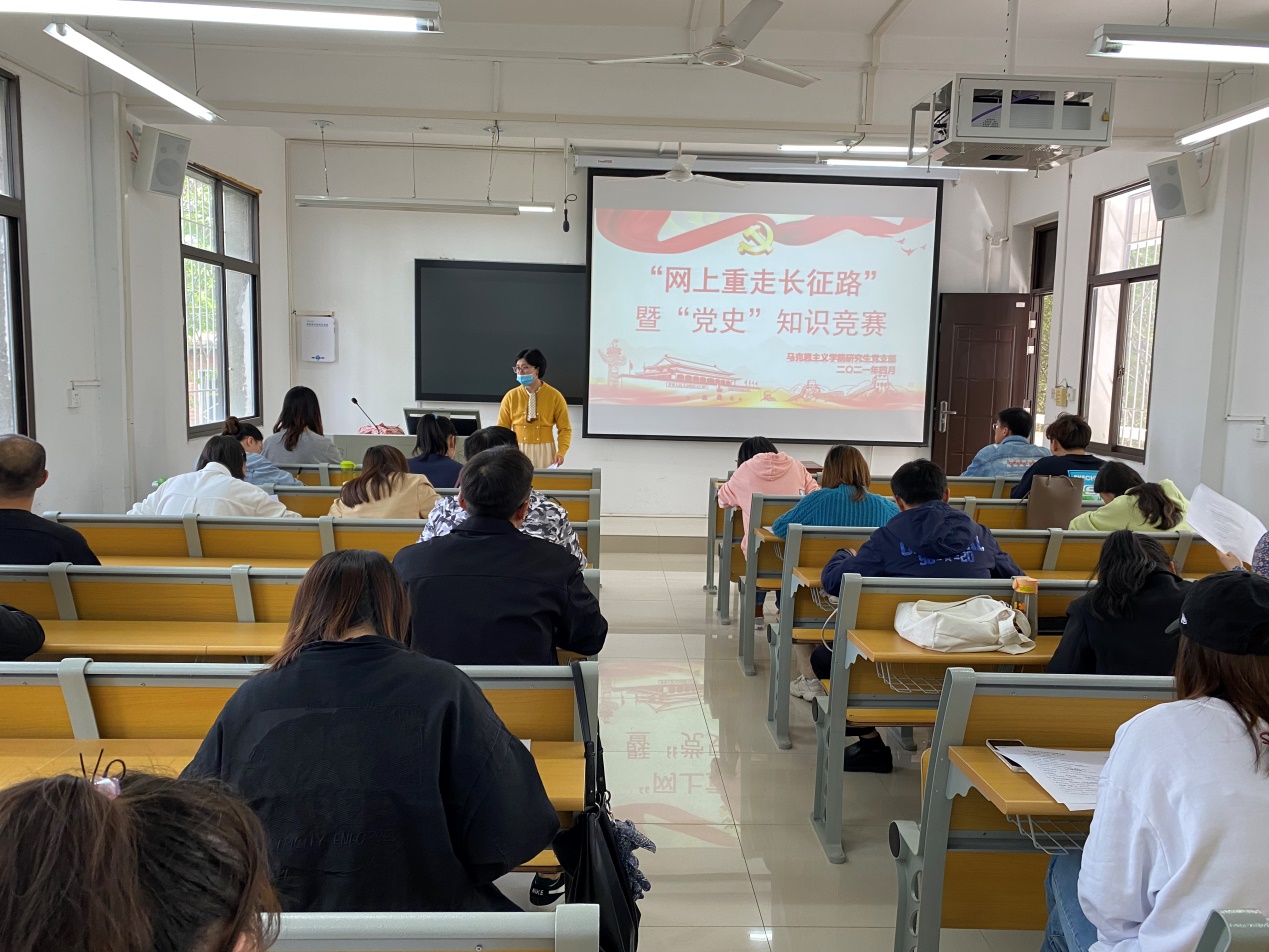 为深入贯彻落实习近平总书记在党史学习教育动员大会上的重要讲话精神,引导广大党员同志感悟百年辉煌党史,坚定理想信念。4月27日下午,在教五203教室我院研究生党支部开展“网上重走长征路”暨“党史“知识竞赛答题活动,支部全体党员、入党积极分子参加此次活动,活动由支部书记郑晨霞老师主持。