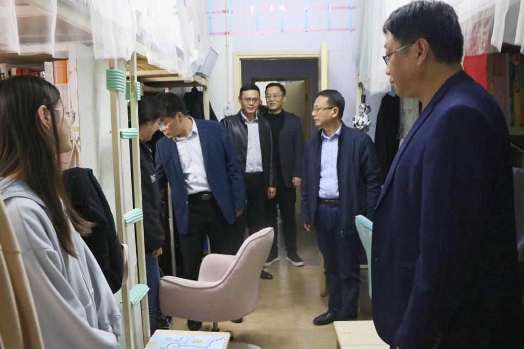 走访过程中,我院领导对学生宿舍安全、卫生、设施、文化建设等方面逐一进行了检查,提醒同学们要提高安全防范意识,养成良好的生活习惯。学院党委书记朱四倍重点检查了学生宿舍安全及用电情况,他叮嘱同学们要注意宿舍卫生和用电安全,鼓励同学们相互包容、相互理解,努力营造一个安全、卫生、文明、和谐的宿舍环境。他提醒同学们要严格遵守宿舍管理规定,注意人身和财产安全,保持健康的生活作息和良好的生活习惯;学院院长唐国战与学生亲切交谈,询问同学们的日常生活和学习情况。他鼓励同学们合理安排学习时间,充分利用图书馆资源学习,积极参加课外活动提高实践能力。同时,他强调,同学们应尽量减少不必要的外出,严格遵守学校疫情防控的各项规定,在宿舍要及时通风,做好个人防护;主管院长程晋富细心叮嘱同学们天气早晚温差大,注意增减衣物,预防感冒,严格遵守《信阳师范学院学生住宿管理规定》,共同创造一个安全、温暖的生活、学习环境。