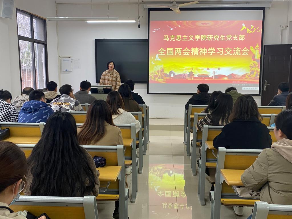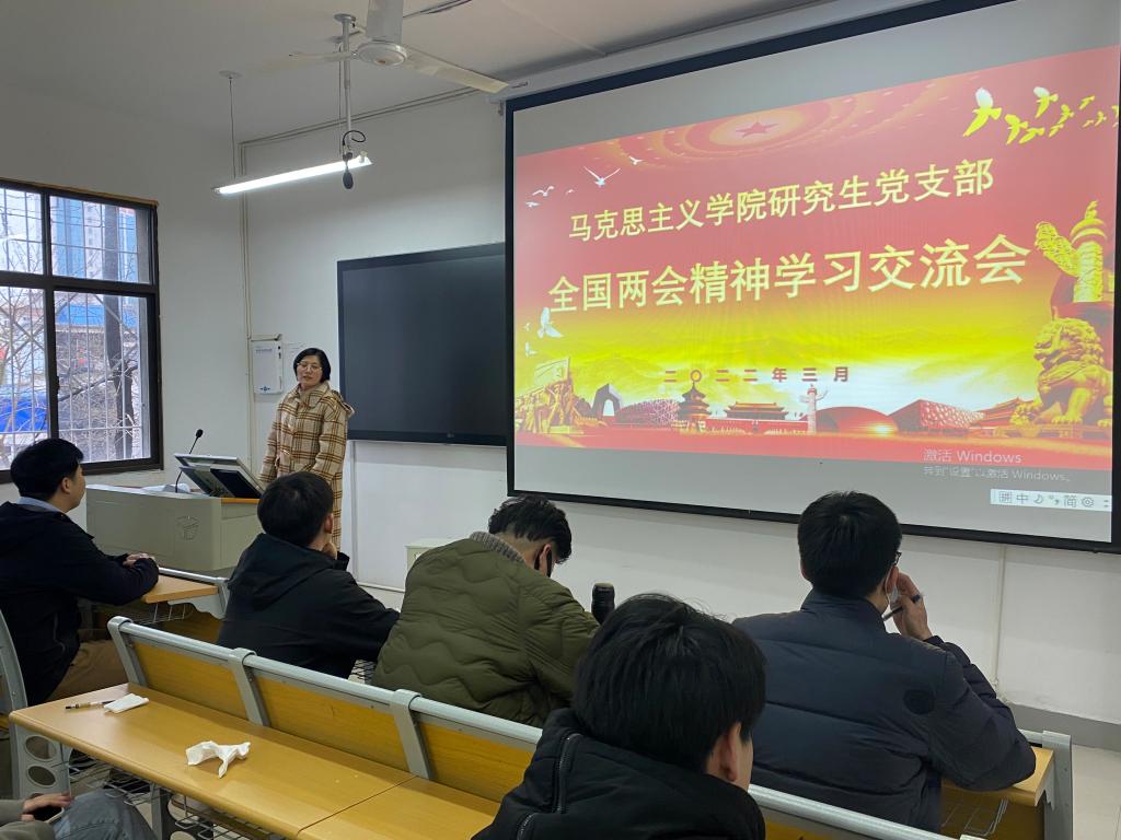为深入学习贯彻2022年全国两会会议精神,提高我院研究生党员的政治素养和知识素养,增强把“两个确立”转化为坚决做到“两个维护”的思想自觉、政治自觉、行动自觉,3月18日,我院研究生党支部组织支部党员于教学楼五楼203教室开展全国两会精神学习交流会。会议由支部书记郑晨霞主持。