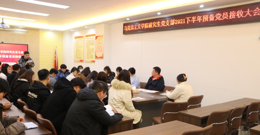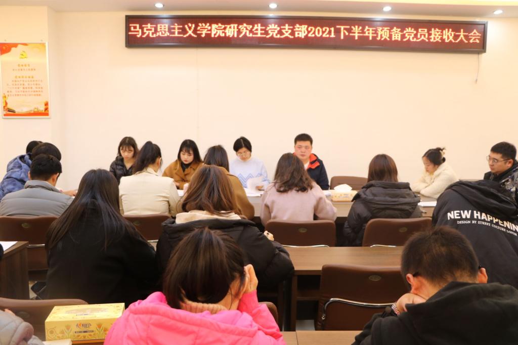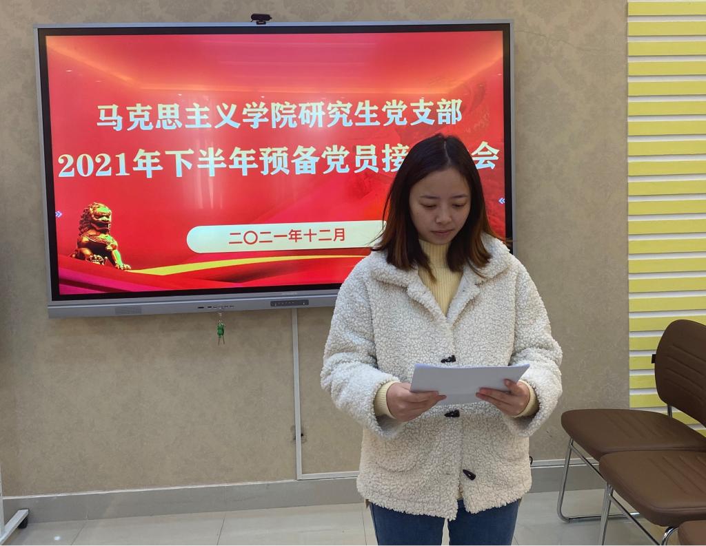 12月2日下午,我院研究生党支部于社科楼323会议室召开2021下半年预备党员接收大会,讨论了王浩、李婷婷、余海玲、张丹雅、张紫鑫、周韵诗、孟祥琳、郭倩、崔浩婷、樊悦十位同志转为中共预备党员的问题。本次会议由支部书记郑晨霞主持,监票人由宣传委员李胜担任,计票人由小组长王澳远担任。