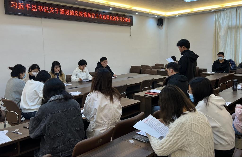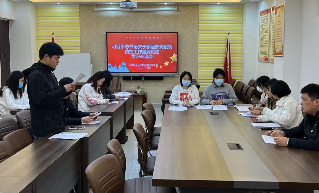 为深入学习贯彻习近平总书记关于做好疫情防控工作的重要讲话及指示精神,帮助我院研究生党员增强“四个意识”,坚定“四个自信”,做到“两个维护,4月2日下午,我院研究生党支部于社科楼323会议室开展集体学习交流会,会议由支部书记郑晨霞主持。