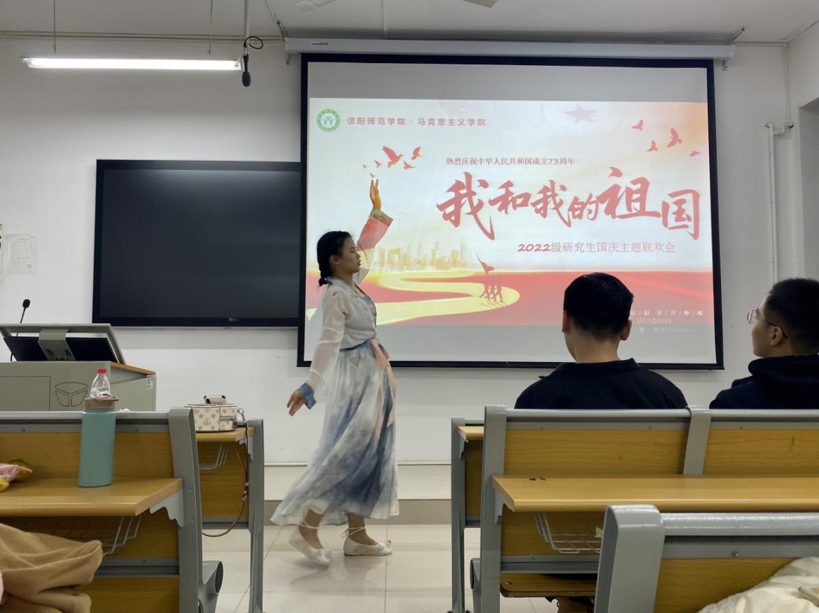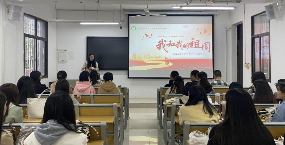 为进一步增进师生情谊、同窗友谊,营造浓厚的国庆佳节氛围,庆祝中华人民共和国成立73周年,2022年10月7日下午,我院2022级研究生及研究生班主任在教五楼203教室开展了以“同心筑梦,欢度国庆”为主题的文艺汇演,师生欢聚一堂,共度佳节,展现出我院师生对祖国的热爱与感激。