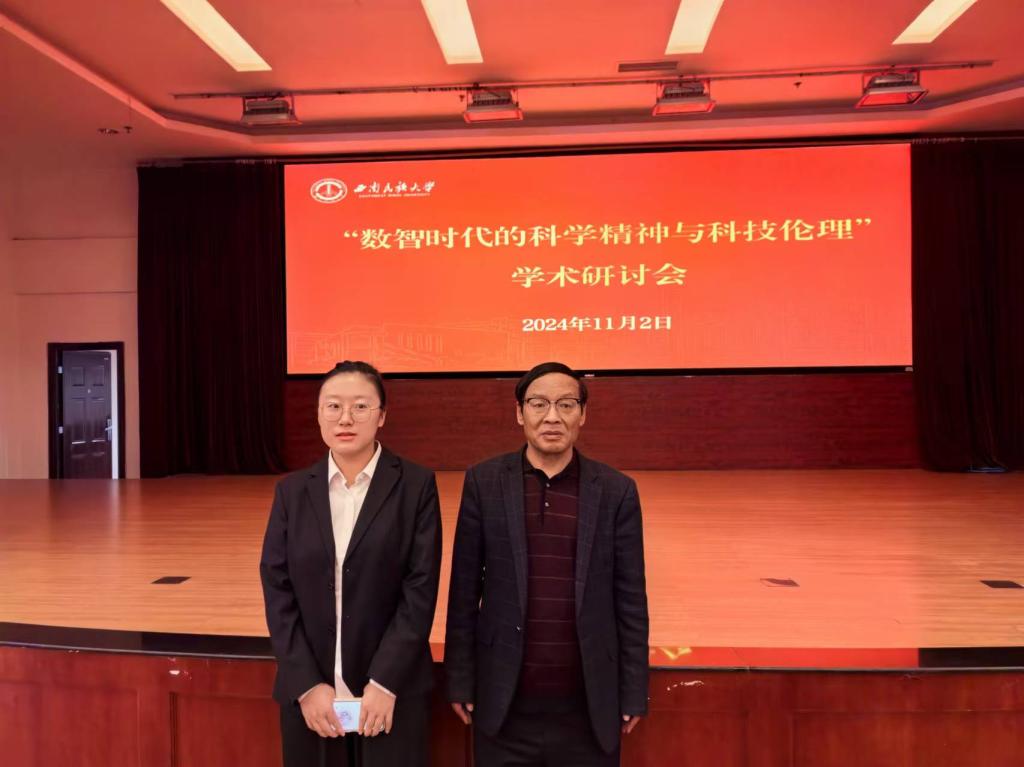 2024年11月1日-3日,“数智时代的科学精神与科技伦理”学术研讨会在西南民族大学举行。受中国自然辩证法研究会科学精神与科技伦理工作委员会以及西南民族大学ok138cn太阳集团529的邀请,ok138cn太阳集团529教授、河南省科学家精神宣讲团成员张铁山及其研究生赵玮嘉同学共同参加了本次学术会议。张铁山教授以“中国科学家精神谱系及其新时代科学家精神培育”为题,从科学精神、科学家精神、中国科学家精神谱系、西方科学家精神的思想源流、中国科学家精神谱系的生成和内容以及新时代科学家精神培育路径等方面作了一场精彩的具有哲理性和科学性的学术报告,得到了与会专家和学者们的好评和赞誉;研究生赵玮嘉同学以“新时代科学家精神融入初中思政课的路径探究”为题,从新时代科学家精神生成的理论和时代背景、新时代科学家精神的本质内蕴以及新时代科学家精神融入初中思政课的有效路径三个方面对新时代科学家精神的传播方法给予了分析,得到了与会专家和学者们的认可和好评。