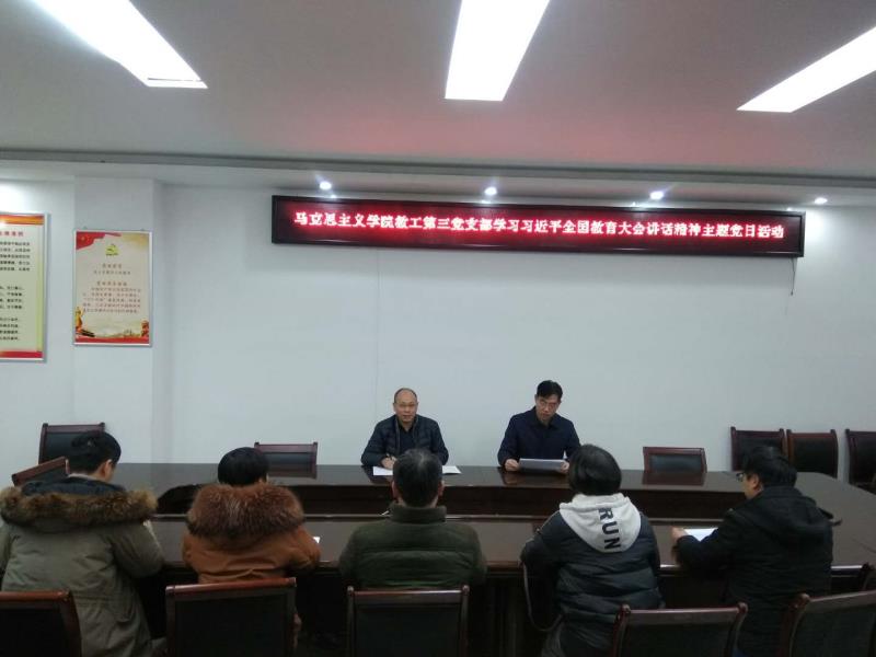 为了充分发挥教工党员的先锋模范作用,树立教工党员的良好形象,2018年12月28日下午,ok138cn太阳集团529教工第三党支部在学院323会议室顺利召开“学习习近平全国教育大会讲话精神”主题党日活动。会议由支部书记厉有国同志主持。