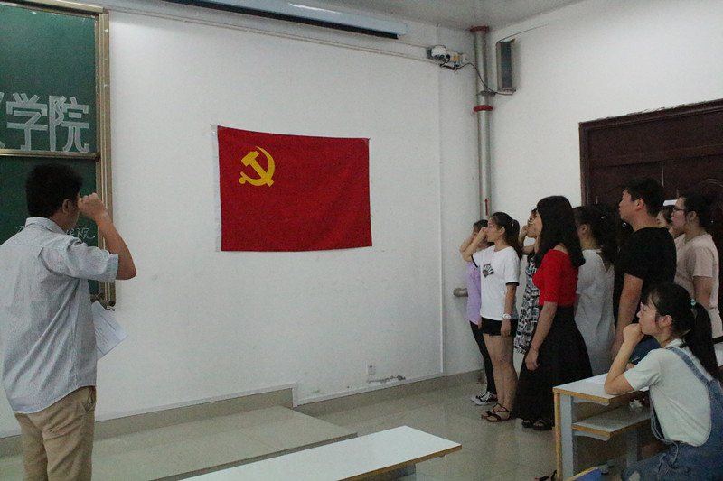 预备党员宣誓仪式在庄严的《国际歌》中开始。由徐永新宣布我院2018年上半年徐豫资等12名学生预备党员名单。在孙绪曙的领誓下,全体党员面对党旗,举起右手庄严宣誓。宣誓后,曹栋发表讲话,他对预备党员提出了三点要求,一是加强理论知识学习,提高专业能力;二是强化党员身份,加强党性锻炼与修养;三是坚定理想信念,明确党员职责,切实发挥好榜样示范作用。随后,预备党员代表赵莹做了发言,表示会牢记入党誓词,拥护共产党的领导,努力提高自身素质,坚定共产主义理想信念,立志做一个有理想有抱负的共产党员。宣誓大会在奏响国歌后结束。