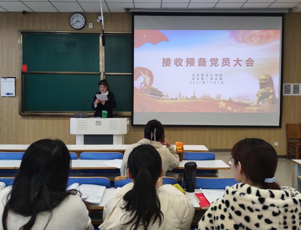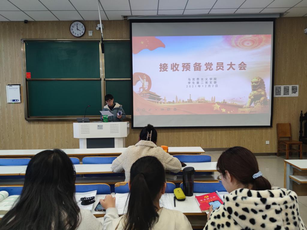 会议严格按照党组织接收预备党员的程序进行。首先,王文慧清点到会人员,宣读党员发展对象名单。随后,刘晓哗、曾乾宇、王誉博、丁洁、杨煦华、周永宁、燕凯旋、周明洋、张靖茹、高乐、张莹十一名申请人依次宣读《入党志愿书》,汇报自己对党的认识、入党动机、本人履历、现实表现、家庭和主要社会关系情况,表达了加入中国共产党的决心。接着,入党介绍人黄子晋同志简要介绍申请人一年来的表现、教育和考察等情况,并就是否同意该同志成为预备党员提出意见。随后,与会党员进行投票表决。经支部表决,一致同意接收刘晓哗等十一名同志为中国共产党预备党员。最后,党支部书记曹梦真同志总结发言,她表示,所有正式党员和预备党员要时刻谨记入党誓词,时刻以身作则,处处严格要求自己,更好地发挥党员模范带头作用。