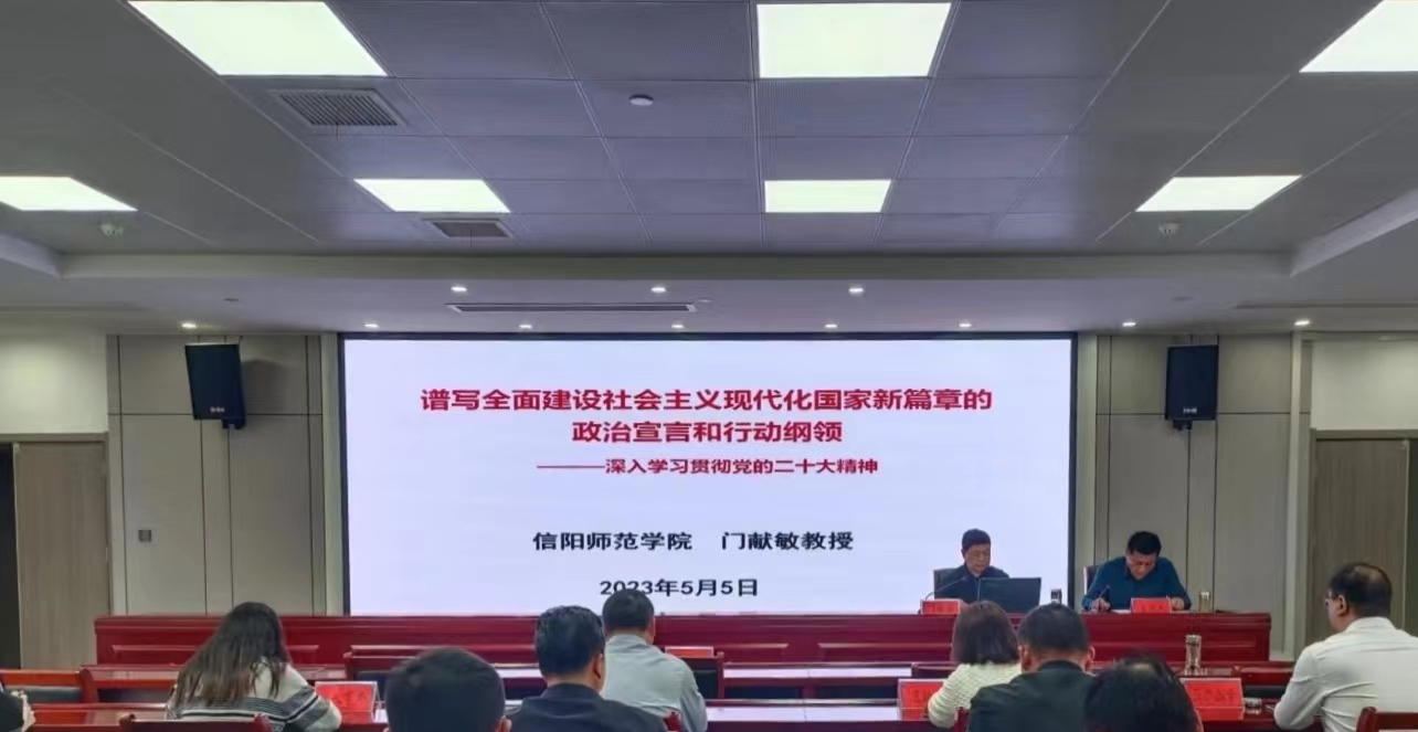 门献敏从充分认识学习党的二十大精神的重大历史意义、深入领会党的二十大的鲜明主题主线和主要成果、准确把握过去五年工作和新时代十年的伟大变革、深刻感悟开辟马克思主义中国化时代化的新境界、全面理解新时代新征程中国共产党的使命任务、深刻把握全面建设社会主义现代化国家的战略安排、科学理解坚持党的全面领导全面从严治党重大部署和奋力谱写新征程上”美好生活看信阳”绚丽新篇章等八个方面,进行了科学阐释。