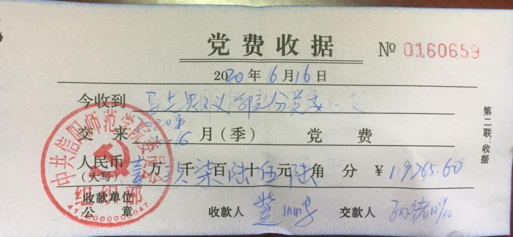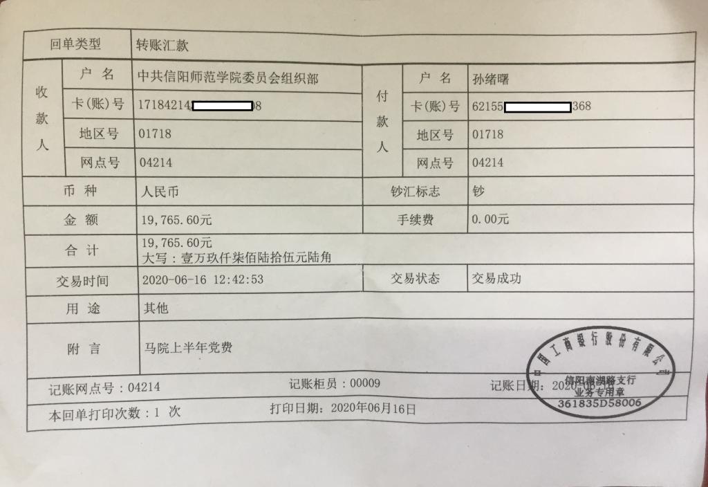 ok138cn太阳集团5292020年1-6月学院师生党员缴纳党费转账单及收据