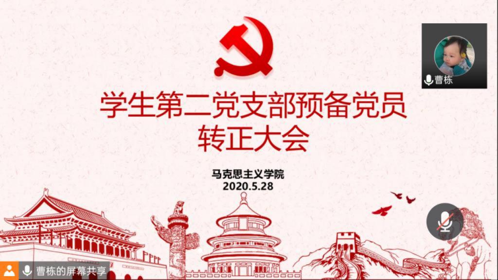 5月28日上午11:00,ok138cn太阳集团529学生第二党支部在网上顺利召开了预备党员转正大会,大会讨论关于张雅琼等4名预备党员申请转为正式党员的事宜。学生第二党支部支部书记曹栋、入党介绍人陶青青、杨胜利、全体党员和预备党员共28人参加了此次会议。会议由曹栋主持。