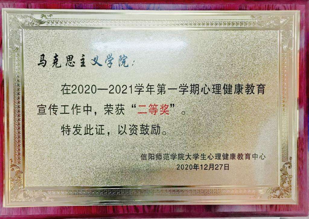 12月29日晚,信阳师范学院大学生心理健康教育中心在逸夫楼报告厅举办“信阳师范学院大学生心理健康教育中心2021年元旦晚会暨年度表彰大会”活动。经评定,我院在第十四届大学生心理健康教育宣传周之心理游园会活动评比中位居第一,在2020-2021学年第一学期心理健康教育宣传工作中,表现突出,荣获“二等奖”,我院学生乔炜林、林兆申、王玮琳被评为“优秀心理工作者”。