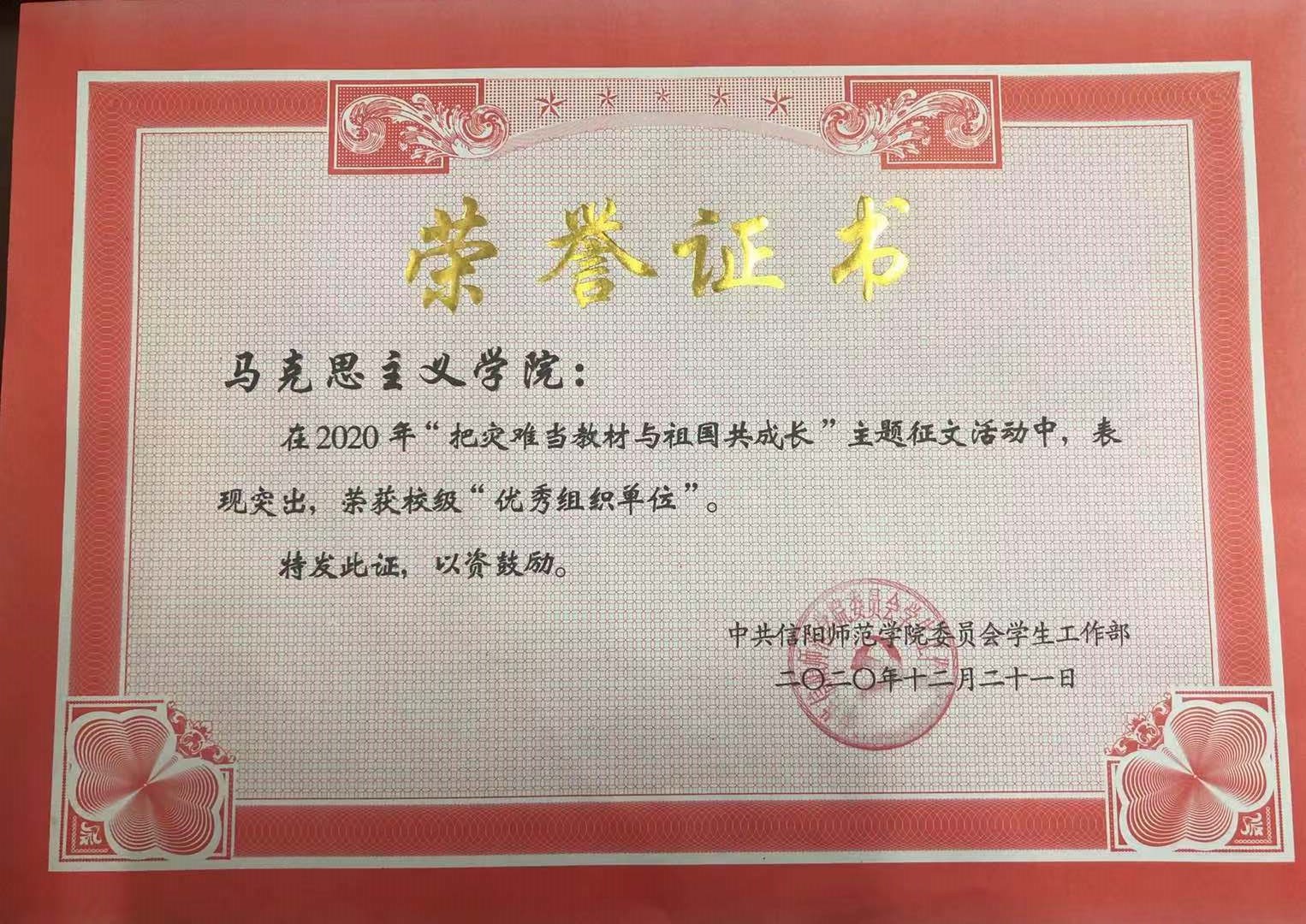 经中共信阳师范学院委员会学生工作部考核审定,我院在学校举办的“把灾难当教材与祖国共成长”主题征文活动中积极参与、表现突出,荣获校级“优秀组织单位”荣誉称号。
