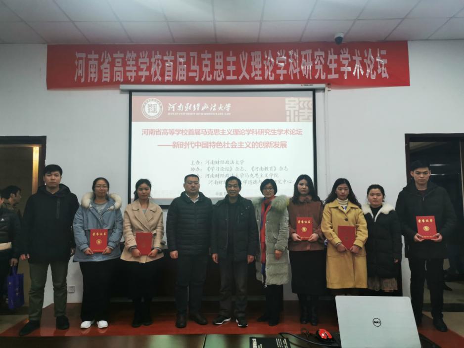 12月28日,“河南省高等学校首届马克思主义理论学科研究生学术论坛——新时代中国特色社会主义的创新发展”学术研讨会在河南财经政法大学举行,我院有7名研究生提交了学术论文并受邀参加研讨会,其中有两位同学在会上作交流发言。经会议组委会评审,我院2018级研究生张英荣获一等奖,2019级研究生詹彦彦荣获二等奖,2019级刘润博等3位学生荣获三等奖。