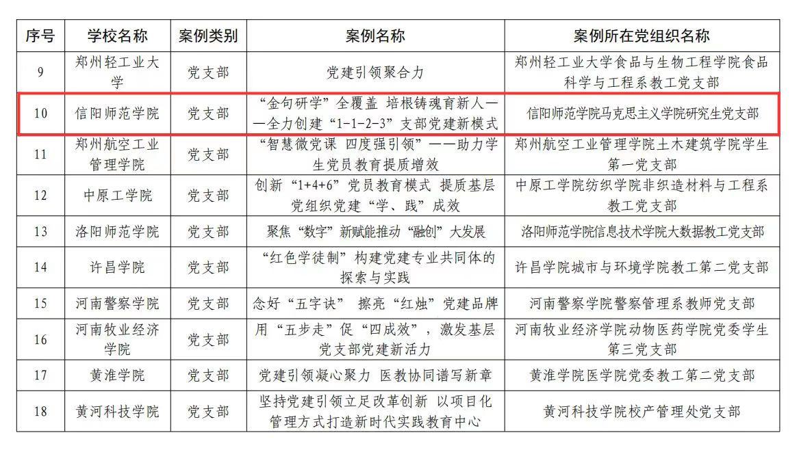 近日,河南省教育厅公布了关于全省高校基层党建创新典型案例评选结果,我院研究生党支部的《“金句研学”全覆盖 培根铸魂育新人——全力创建“1-1-2-3”支部党建新模式》党建创新典型案例荣获高校基层党支部抓党建创新典型案例奖。