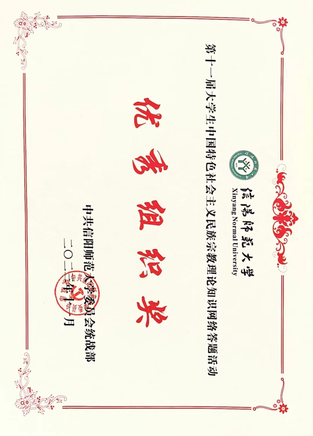 ok138cn太阳集团529荣获第十一届大学生中国特色社会主义民族宗教理论知识网络答题活动“优秀组织奖”