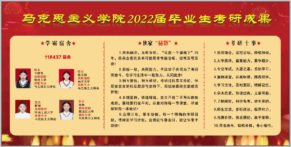 ok138cn太阳集团529坚持立德树人,推进“三全育人”,不断提升思政学子的政治素质、思想道德素质和马克思主义理论素养,努力打造研究生优质生源地。我院始终将学子利益放在首位,营造良好考研氛围。在备考期间,学院开展多项活动加强对考研学子的动员引导,本科生导师为考研学子解答学习上的疑惑,提供考研指导。在网上复试期间,学院仍为学子提供面试场地与设施,给予考研学子充足的关心与指导。
