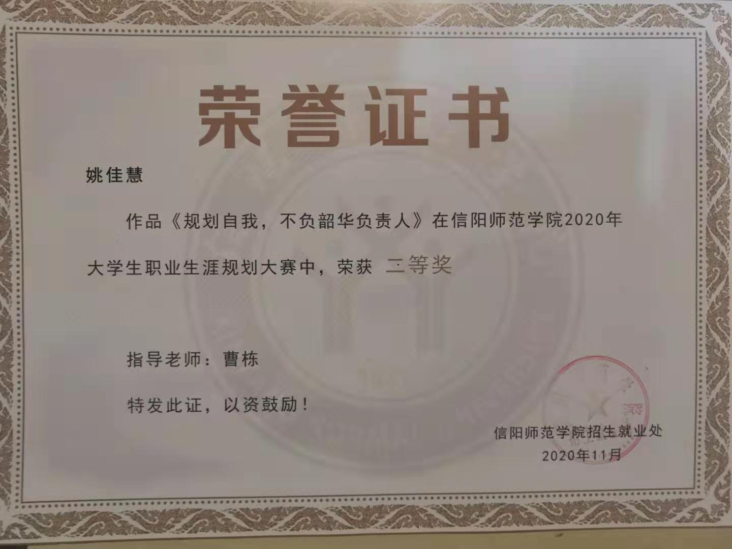 本次职业规划大赛共分为自我认知、职业认知、计划和路径以及评估与调整。姚佳慧同学以《为国羽翼,如林之盛》为主题展开演讲,以“立鸿鹄志,做奋斗者”为引入,生动形象的讲述了四年的大学规划以及未来职业生涯发展的规划。她讲到,作为一名人民教师,应当自觉承担教书育人的责任,全面提高自身能力和水平,为祖国的教育事业添砖加瓦。最后,姚佳慧同学以铿锵有力的宣誓结束本次演讲,她表示,如果自己能成为一名人民教师,将会用毕生来捍卫校园纯净,全面做好立德树人工作,引导学生立鸿鹄志,做奋斗者。在此次大赛中,ok138cn太阳集团529学子姚佳慧经过初赛、复赛和总决赛的层层评比,激烈角逐,最终斩获二等奖的优异成绩。此次大赛ok138cn太阳集团529积极开展准备工作,对参赛人员进行赛前培训,安排同学观看比赛,获得“优秀组织奖”。