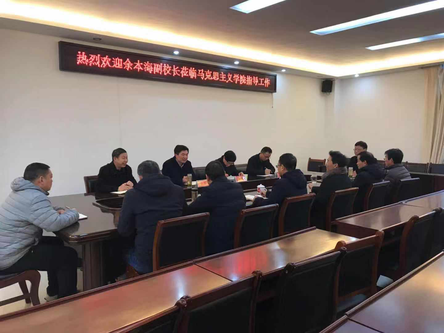 余本海首先代表学校向学院全体师生致以新年的祝福并给予新学期的期望。学院院长杨云善首先对各位专家的到来表示热烈的欢迎,然后从人才培养、专业建设、课程建设和本科教学等方面简要介绍了学院的工作重心。教学副院长程晋富从新学期教学任务的落实、多媒体教室的检修、习近平教育思想重要论述课件和教案的制作等开学前的准备,专业建设、课程建设、教学资源库建设等情况和建设设想作了详细汇报。
