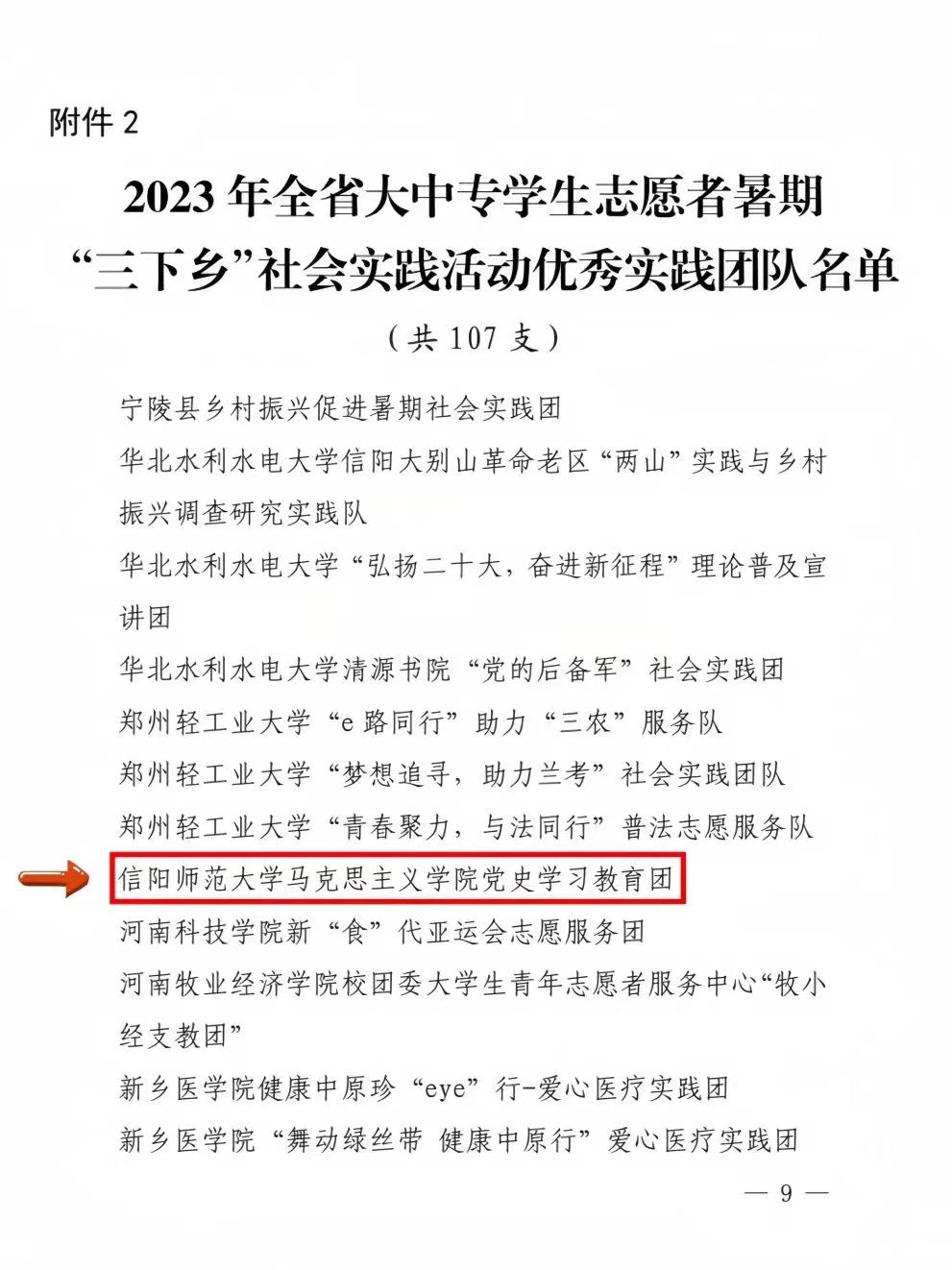 近日,中共河南省委宣传部、共青团河南省委、河南省教育厅、河南省学生联合会下发《关于2023年全省大中专学生志愿者暑期文化科技卫生“三下乡”社会实践活动的通报》,我院“青春共学‘习’,奋进新时代”党史学习教育团荣获2023年全省大中专学生志愿者暑期“三下乡”社会实践活动优秀实践团队,是我校唯一入选的优秀实践团队。