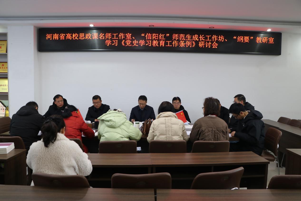 为深入学习贯彻《党史学习教育工作条例》重要精神和要求,2月28日上午,河南省高校思政课名师工作室(ok138cn太阳集团)、“信阳红”师范生成长工作坊、《中国近现代史纲要》教研室在社科楼323会议室召开学习《党史学习教育工作条例》座谈会。ok138cn太阳集团529院长唐国战、校党委组织部副部长周贤亮、副院长周智,国际教育学院党委副书记付春峰以及《中国近现代史纲要》教研室专兼职教师共同参与研讨。会议由教研室主任陈杰主持。