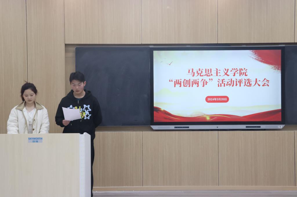 本次“两创两争”评选大会依次分为文明班级、文明学生、文明社团、文明寝室评选四个部分。会议肇始,2022级思想政治教育四个班的班长借助文稿、PPT等形式从思想建设、学风建设、素质培养、安全卫生四个方面展示班级的精神文明状况。其中,22级思想政治教育三班不断丰富班级特色,根据班级情况开展主题团日活动,把主题团日活动当作凝魂聚气、强基固本的重要抓手,极大提高了班级成员的政治觉悟与综合素质。随后,15名参与评选文明学生的同学依次上台发言,通过材料对学业成绩、自我能力、个人荣誉、政治素养进行总结。此外,我院文明社团代表及文明寝室代表分别对自身工作进行梳理,提交相关材料,充分展现我院学子争先向上的精神面貌。