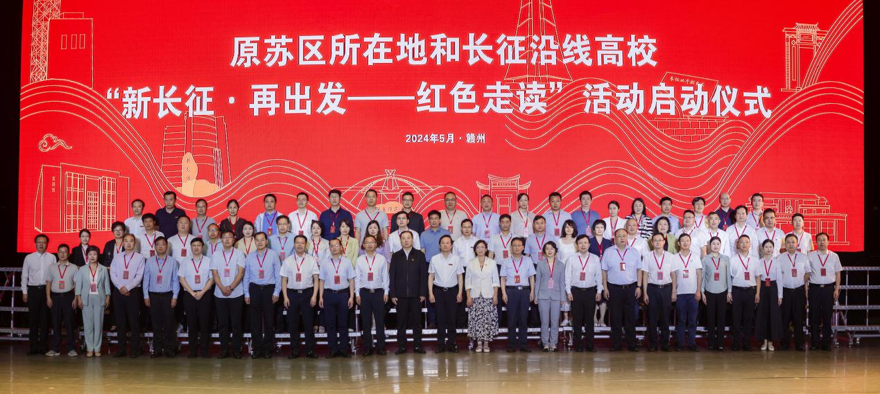 在中央红军长征出发90周年、习近平总书记考察赣南老区5周年之际,5月20日,由赣南师范大学、延安大学、海南师范大学、湖北师范大学、ok138cn太阳集团、江西理工大学等17所高校联合发起的原苏区所在地和长征沿线高校“新长征·再出发——红色走读”活动启动仪式在赣南师范大学举行。原苏区所在地和长征沿线高校分管校领导、党委宣传部、学工部、ok138cn太阳集团529负责同志,瑞金中央革命根据地纪念馆、于都中央红军长征集结出发地等历史博物馆负责同志共计1000余人参加仪式。仪式由赣南师范大学党委副书记刘民主持。我校ok138cn太阳集团529院长唐国战、《中国近现代史纲要》教研室主任陈杰、分团委书记陶青青受邀参加本次活动。