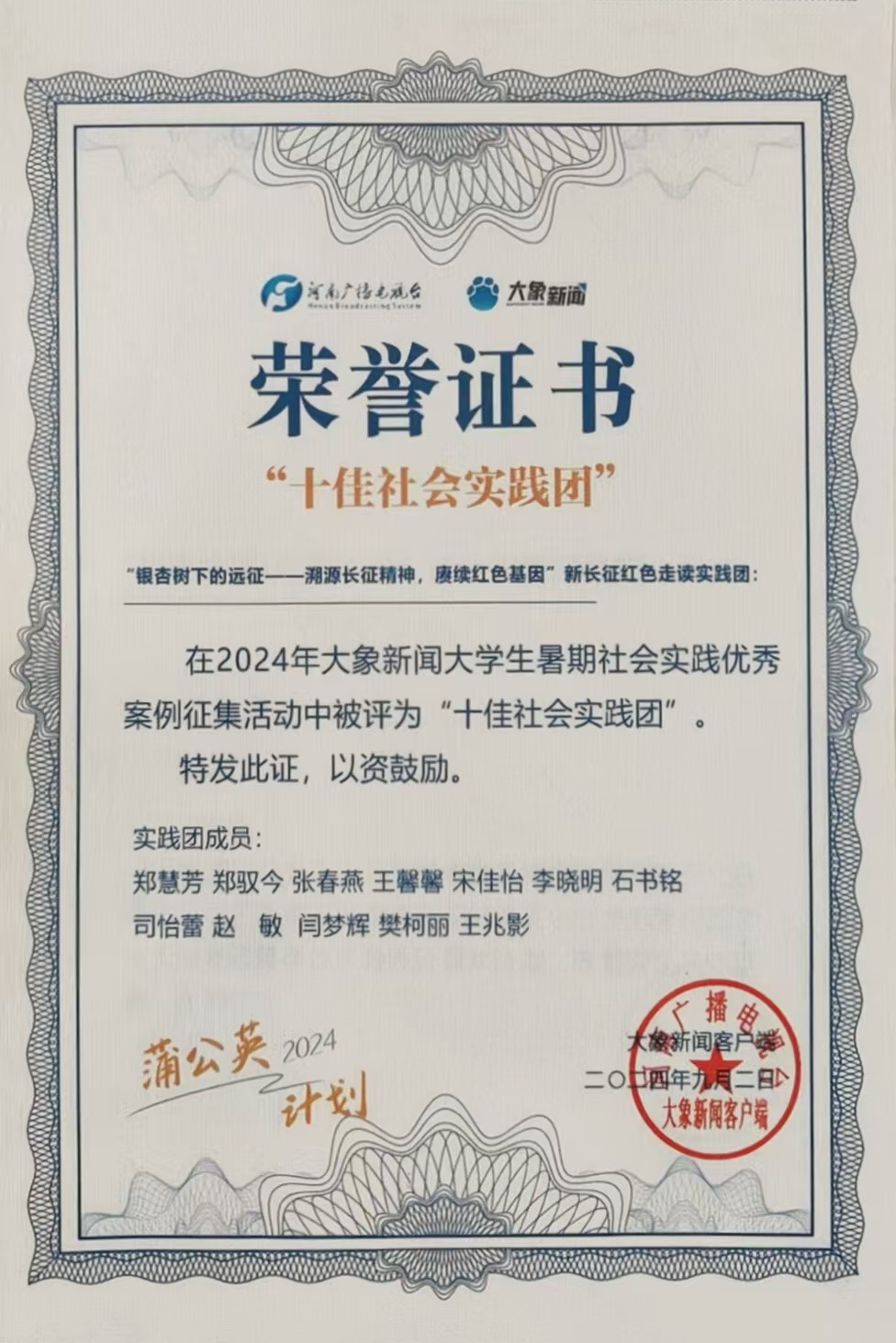 9月2日,由河南省广播电台主办的大象新闻“蒲公英计划”大学生社会实践活动获奖名单公布。我院“银杏树下的远征——溯源长征精神,赓续红色基因”实践团荣获“十佳团队”,指导老师陶青青荣获“优秀带队老师奖”,2022级本科生刘英凯荣获“优秀个人奖”。