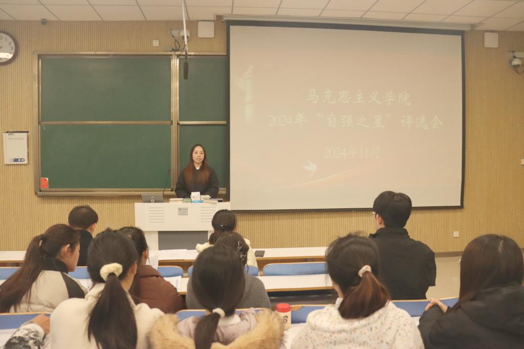 陶青青对本次评选大会做出总结。首先,她指导选手发挥个人优势,树立榜样力量,带动同学们积极响应国家号召,将小我融入大我。其次,她要求在场学生要有榜样、有目标、有信仰,以“自强之星”为标杆,努力成为一个全面发展、德才兼备的思政骨干同学。最后,她强调此次评选会不仅是对个人奋斗历程的肯定,更是对我院自强精神的传承和弘扬,她鼓励学院学子在未来的学习和生活中继续发扬自强精神。