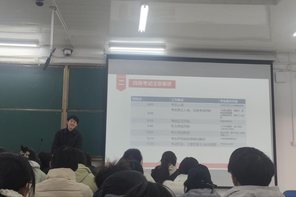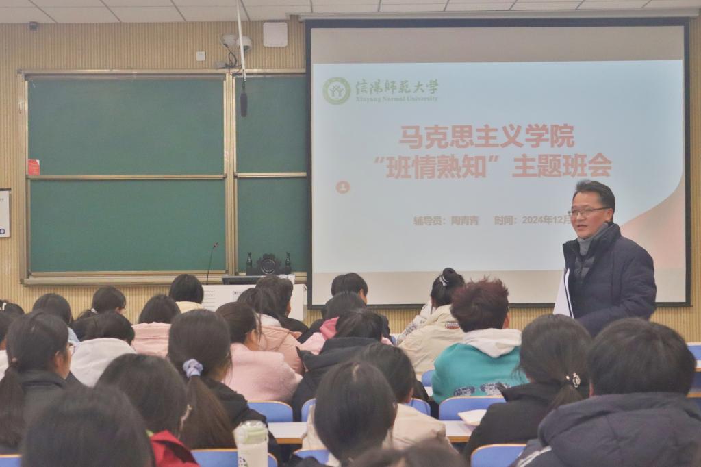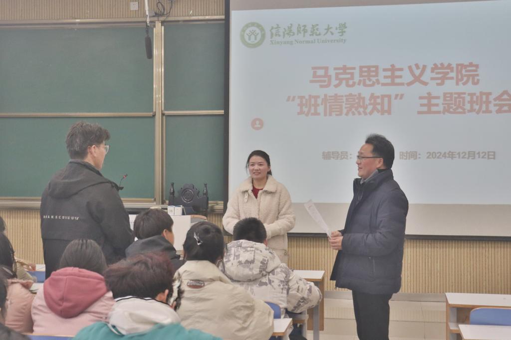沈海蓄对所带2023级思想政治教育一班班情作简要介绍,展示了其在思想引领、班级文化等方面的特色做法,并向学生们传授四六级考试的经验。他表示要优化班级管理、促进学生发展、加强家校沟通。陶青青结合PPT分别从班级概况、班级荣誉、班级活动、学生家庭情况等方面依次介绍,她从“以学生为中心、产出导向、持续改进”三位一体的带班理念着手,介绍班级管理工作以及特色活动的开展状况,并对班级工作做出指导和规划。她强调要通过创新工作方法和提高效率,培养学生的综合素质和责任感。最后,李贵杰进行班级随机考察环节。沈海蓄、陶青青对同学们的籍贯、爱好、家庭状况等信息的熟悉情况,受到检查组领导高度评价。