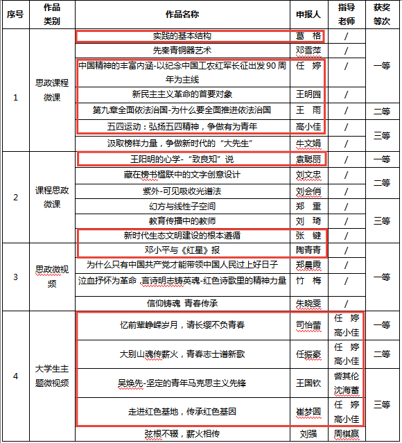 近日,根据《关于开展2024年度河南省大思政微课(微视频)征集活动的通知》要求,河南省社科联、共青团河南省委、河南省高等教育学会、河南省高等学校思想政治理论课教学指导委员会组织专家评委会,对2024年度河南省大思政微课(微视频)征集活动申报作品进行了评选,ok138cn太阳集团52912件参赛作品均获奖(框红内)。其中,思政课程微课类作品一等奖3人、二等奖1人、三等奖1人;课程思政微课类作品一等奖1人、三等奖1人;思政微视频类作品一等奖1人;大学生主题微视频类作品一等奖1人、二等奖1人、三等奖2人。