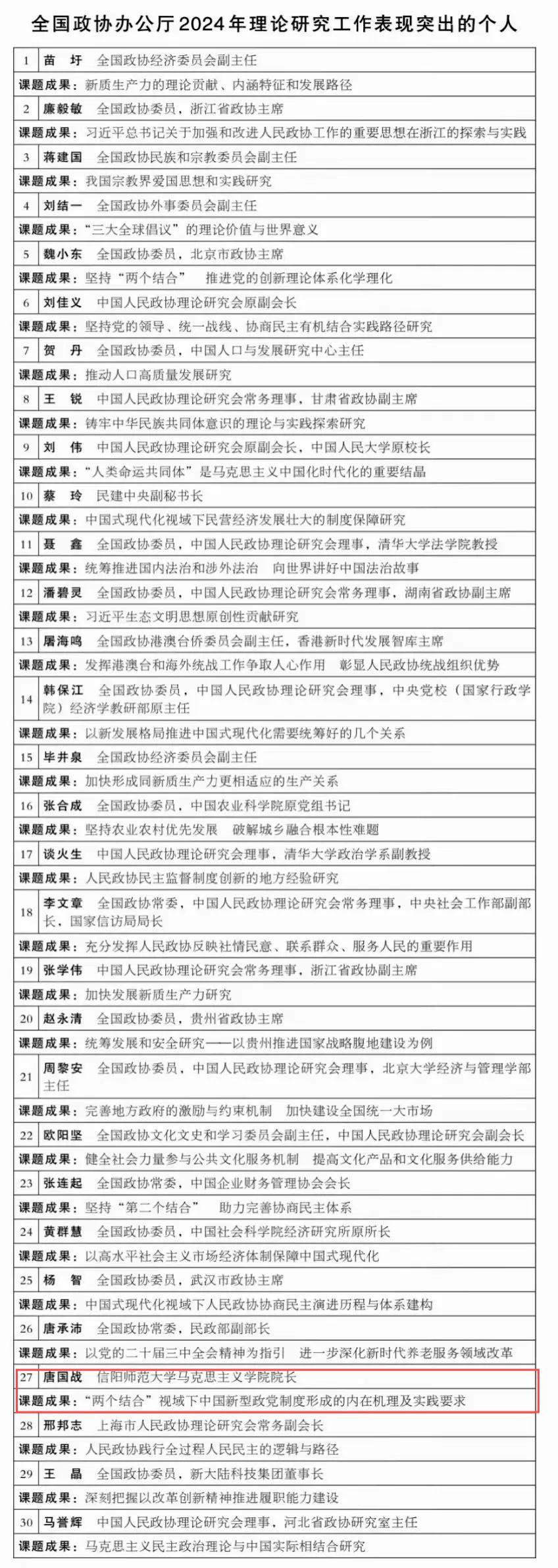 2月22日,全国政协办公厅对在2024年理论研究工作中表现突出的30位个人进行通报表扬,我院唐国战教授的课题成果“‘两个结合’视域下中国新型政党制度形成的内在逻辑和实践要求”获通报表扬。
