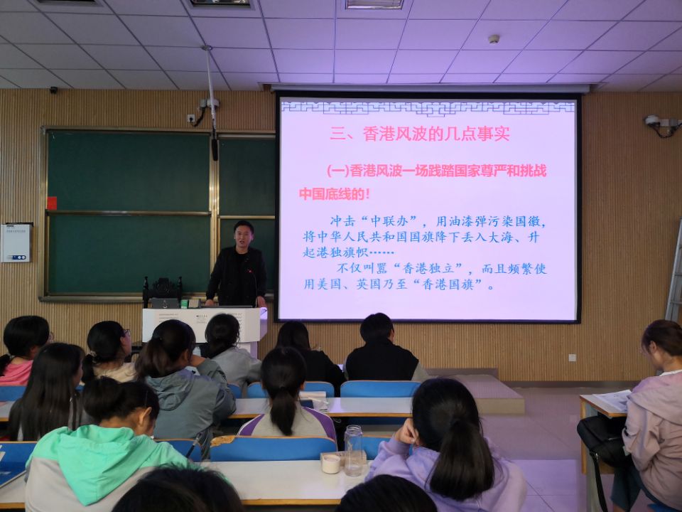 曹栋以近期的乱港事件为主线,深入剖析了香港风波的起源,发展脉络以及有关事实,阐明了香港风波是一场有组织、有预谋的祸港乱港事件。接着,他向同学们讲述修例事件,播放香港修例事件的相关视频,让同学们更加直观地感受到香港风波背后的实质性问题。同时,他向同学们分享了有关乱港事件的评论性文章,引导大学生努力坚定理想信念,提高自身思想文化素质,形成独立思考的能力。最后,曹栋激励同学们应勇于担当、勇于奋斗,肩负起时代的使命、建设强大的中国。