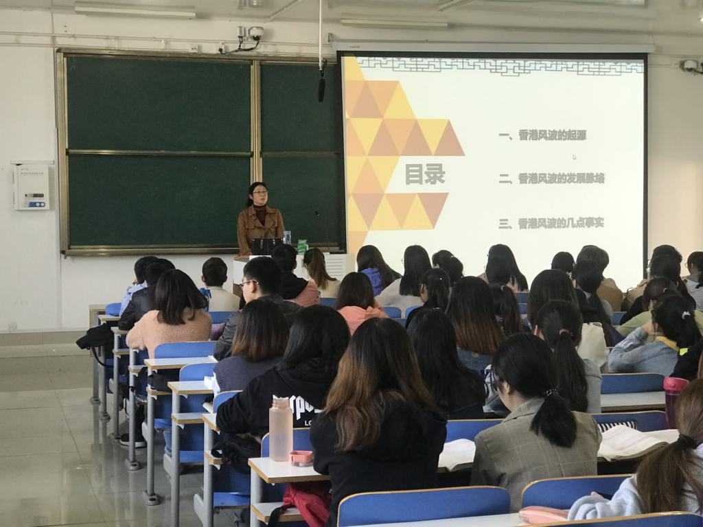 为增进我院学生对国内外形势与政策的了解,加强学生思想政治教育,10月15日下午,ok138cn太阳集团529副教授黄玲丽与团委书记曹栋分别在社科楼514教室、515教室为我院学生讲授了题为“香港风波”的形势与政策课。我院全体同学分班级同时同步共同聆听了本专题讲学。