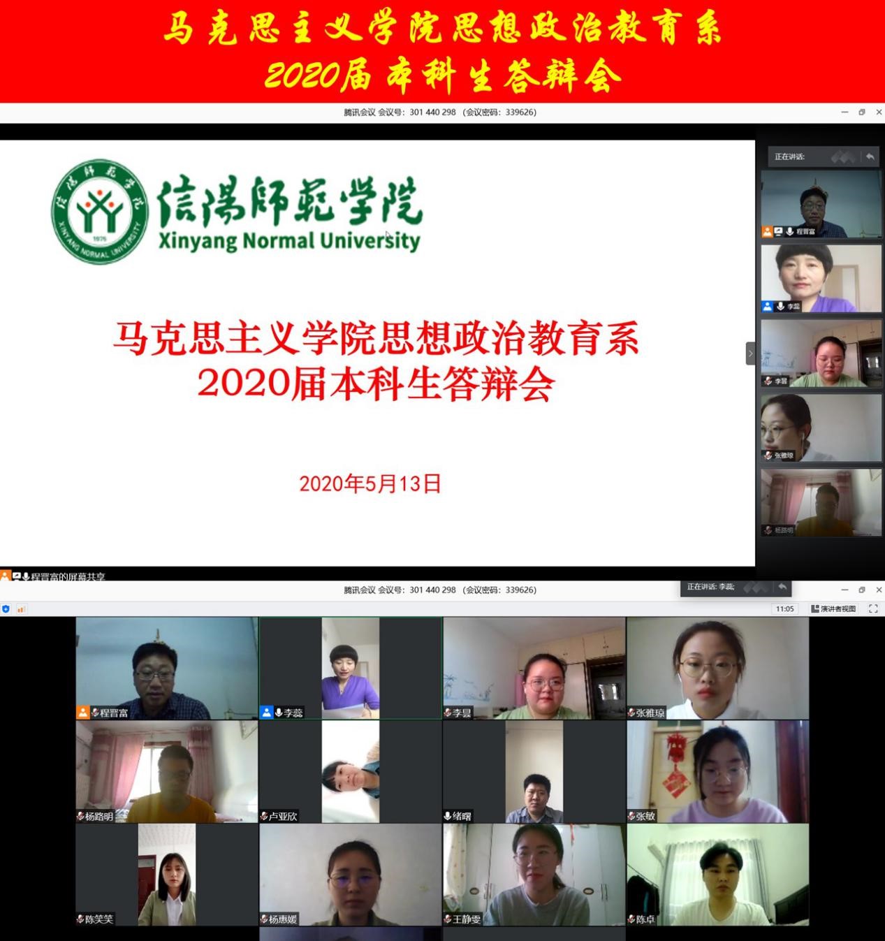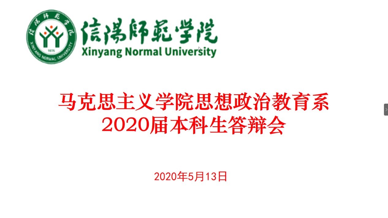 搏“疫”在线,辩出精彩。按照教务处《关于做好2020届本科毕业论文(设计)有关工作的通知》及《ok138cn太阳集团529关于2020届思想政治教育专业本科毕业论文答辩工作的通知》要求,我院思想政治教育教研室于5月13日通过腾讯会议平台开展了2020届本科生毕业论文线上答辩会议,程晋富、李蕊、孙绪曙作为答辩专家组老师参加会议,张雅琼、吴素豫、杨惠媛、李昙、卢亚欣、张敏、杨路明、陈笑笑、陈卓、王靖雯10名同学参加了答辩,答辩持续时长近三个小时。会议由李蕊主持。