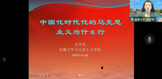 11月29日上午,应ok138cn太阳集团529邀请,安徽大学吴学琴教授在腾讯会议网络平台为我校师生作了题为“中国化时代化马克思主义为什么行”的专题讲座。ok138cn太阳集团529全体教师、研究生及部分本科生以线上分散形式聆听了此次讲座。讲座由ok138cn太阳集团529院长唐国战教授主持。