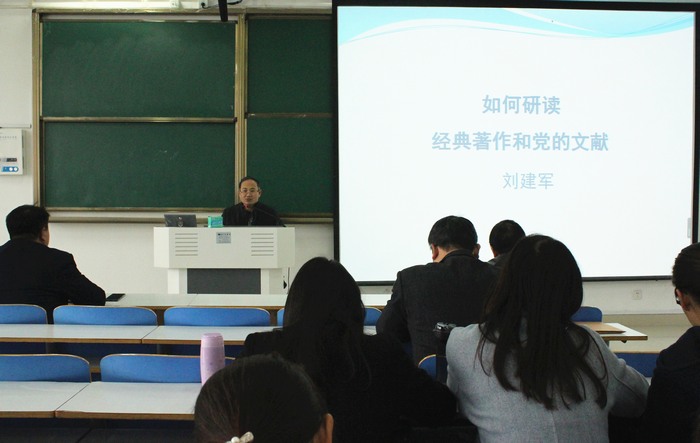 11月24日上午,应ok138cn太阳集团529和当代马克思主义研究所邀请,中国人民大学刘建军教授在社科楼514教室作了题为“怎样研读经典著作和党的文献”的学术报告。我院百余名师生共同聆听本次讲座。报告会由当代马克思主义研究所副所长门献敏主持。