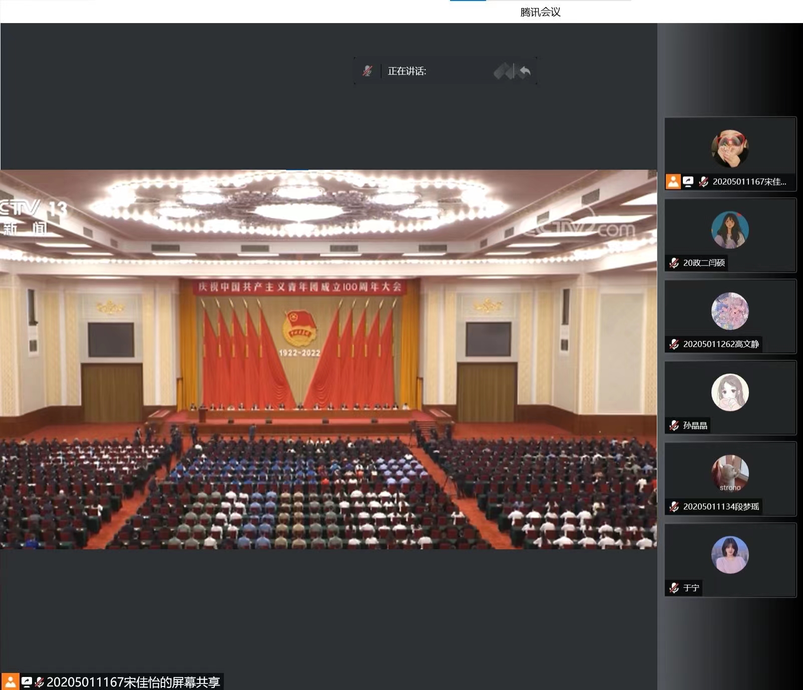5月14日晚,ok138cn太阳集团529第三期优秀“青马”工程学员们通过腾讯会议共同观看习近平总书记在庆祝中国共青团成立100周年大会上的讲话。活动由班长宋佳怡主持。