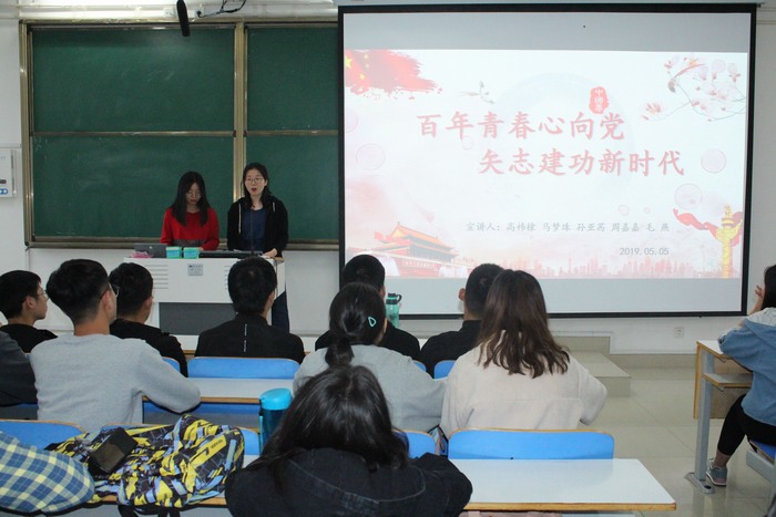 2019年5月7日,优秀“青马”工程第一组学员在社科楼514教室开展以“百年青春心向党,矢志建功新时代”为主题的团日宣讲活动。我院团委书记曹栋、河南省青马工程学员2016级思想政治教育一班史弘扬、优秀“青马”工程学员以及18级全体学生共同参与本次团日活动。活动由青马学员2018级思想政治教育二班靳雨露主持。
