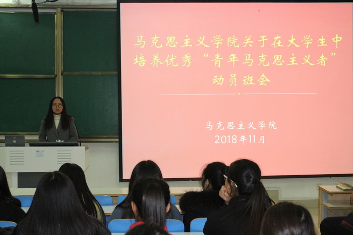 为培养优秀青年马克思主义者,坚定大学生马克思主义信仰,11月25日晚,ok138cn太阳集团529在社科楼514教室顺利开展关于在大学生中培养优秀“青年马克思主义者”动员班会。团委老师曹菁菁、河南省“青年马克思主义培养工程”学员史弘扬和我院2017、2018级全体同学共同参加本次班会。此次班会由曹菁菁主持。