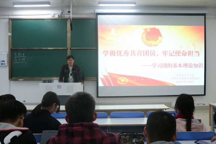 为丰富我院学子与团相关的基本理论知识,增强我院团员的责任感和使命感,11月26日下午,我院“学做优秀共青团员 牢记使命担当”主题团课在社科楼516教室顺利召开。我院2018级全体团员共同参加了此次团课。本次团课由河南省“青马工程”学员史弘扬主讲。