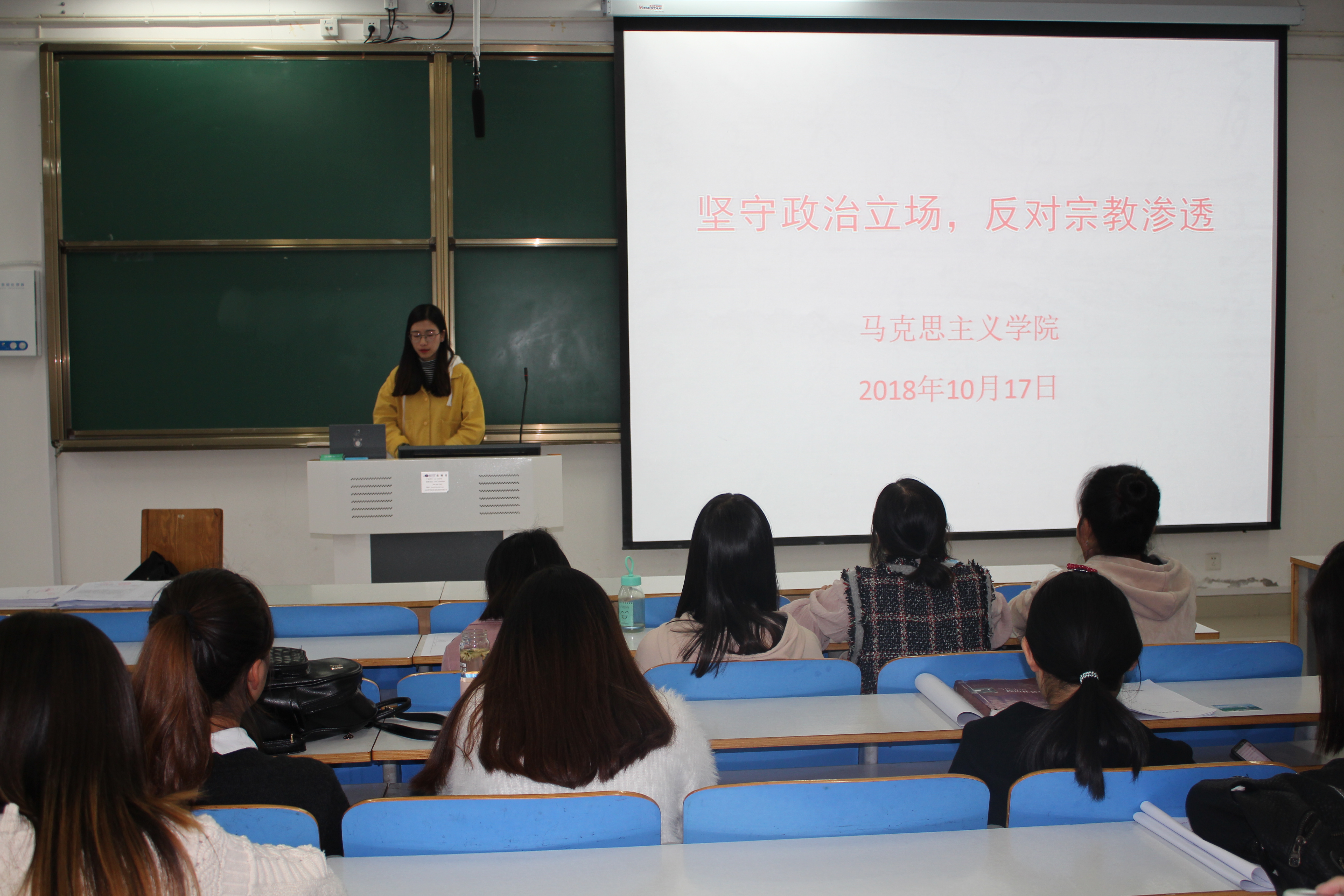 会上,张英就我国宗教政策、邪教危害、如何区分邪教宗教三方面展开叙述。同时,她提出三点要求。一是,我国实行政教分离原则,宗教不能干涉国家教育制度。作为思政学子,我们要用科学思想武装自己,坚持无神论,防止宗教渗透。第二,作为一名合格大学生,要认清邪教,杜绝加入邪教组织,维护自身安全。第三,我们要从发展历史、活动形式等方面正确区分邪教和宗教,保持清醒头脑,抵制邪教。随后,团支书刘润蕊指明邪教传播手段与途径,警示同学们要正确区分邪教和宗教。最后,曹栋作出总结,他指出,宗教与教育是有严格区分的,教育法明确规定宗教不能渗透到教育中。作为即将实习的大四学生,在实习单位有责任和义务反对宗教渗透。同时,要提高自我保护意识,树立正确思想。
