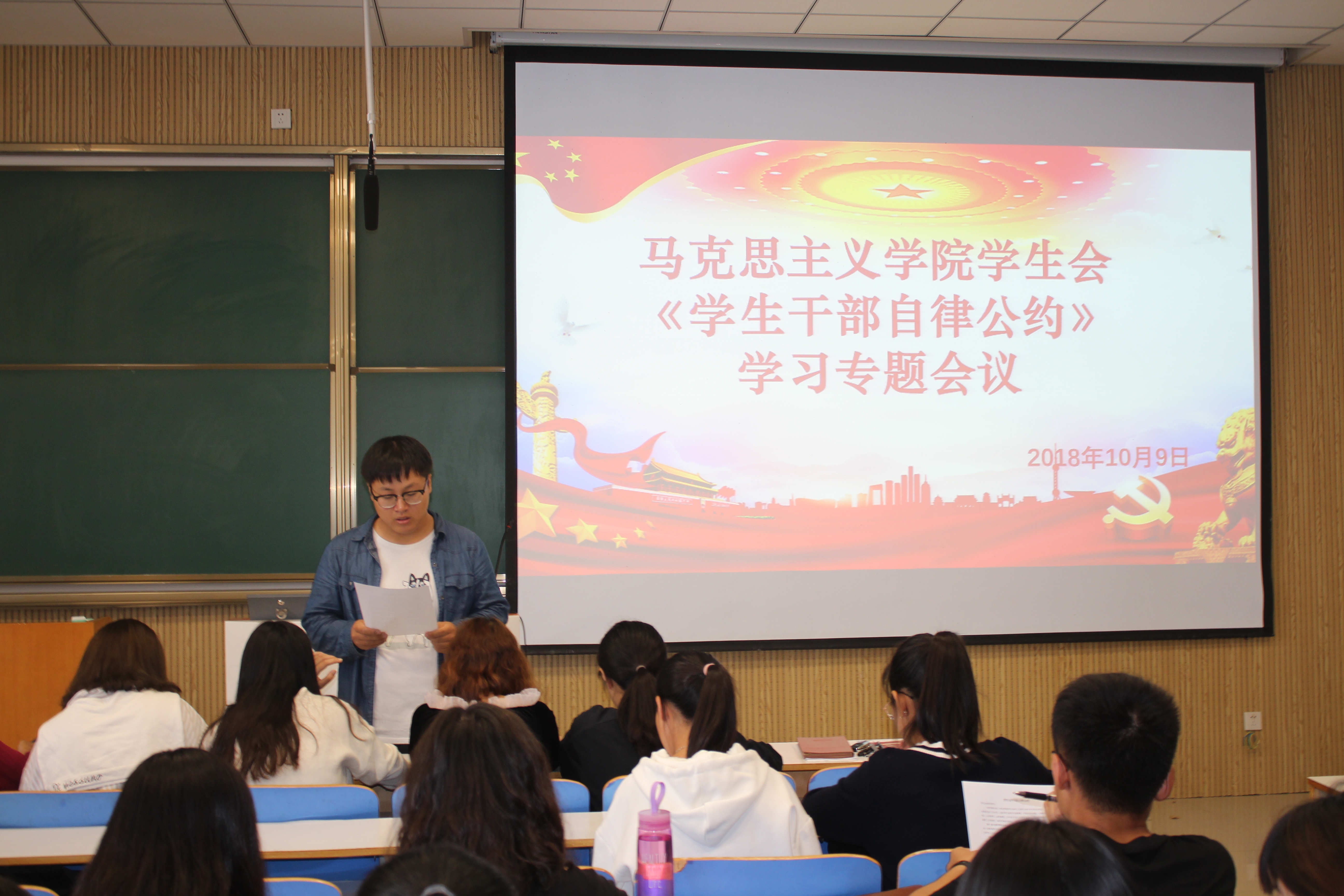 为建设一支胸怀理想、心系同学、品学兼优、作风扎实的学生骨干队伍,10月9日上午,我院在社科楼515教室举行ok138cn太阳集团529《学生干部自律公约》学习专题会议。我院学生会主席团,学生会各部门、社团及各班级负责人共同参加此次会议。本次会议由学生会主席史弘扬主持。