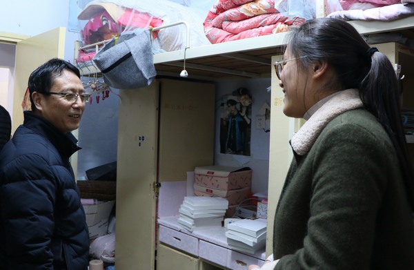 唐国战一行先后走访了我院学生所在的1号、4号宿舍楼。在走访过程中,唐国战亲自核实宿舍人员到校情况,并与学生展开亲切的交流。他对同学们的寒假生活状况以及寒假调研内容进行了仔细询问,并叮嘱大家注意天气变化、用电安全,为新学期上课做好准备。领导老师们悉心询问了同学们在学习、生活方面的困惑,同时也给出自己的建议。同学们听后纷纷表示获益匪浅,收获良多。
