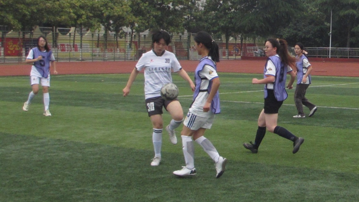 随着裁判的一声哨响,比赛正式开始。双方球员迅速进入比赛状态,比赛开场一分钟,我院22号球员杨如凤先发制人拿下赛场第一分,极大鼓舞了我方士气,展现了她精湛的技术素养和昂扬的拼搏姿态。对方球员不甘示弱,迅速展开猛烈反攻,我院球员毫不怯懦,沉着应对,严防死守,比赛进入白热化阶段。中场休息时,我院教练指导球员分析总结上半场比赛经验,进行人员调配与战术调整。下半场比赛时,双方攻势此起彼伏,赛场气氛愈加紧张。我院球员以巧妙的传球技术、出色的盘带脚法、默契的团队配合和缜密的队形部署对抗对方的猛攻,攻防兼备,双方在胶着状态之下均未进球。临近赛点,我院球员毫不松懈,不留任何反超机会。最终,我院女子足球队以1:0的比分赢得小组赛,我院学子热情高涨,掌声热烈。