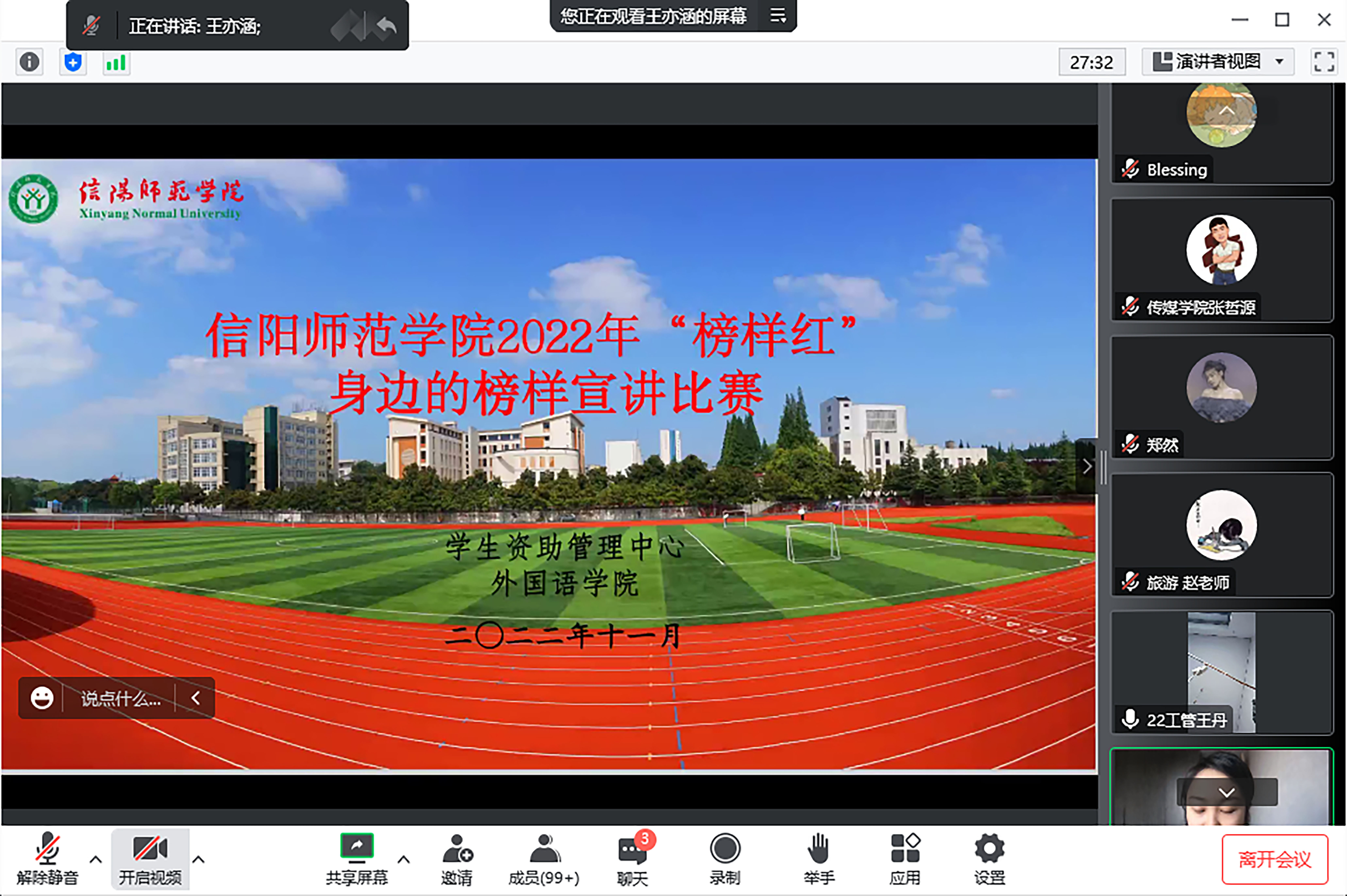 11月30日下午,ok138cn太阳集团529在腾讯会议上开展“身边的榜样”宣讲活动。宣讲人传媒学院校园明星张哲源、音乐与舞蹈学院自强之星李佳潞、外国语学院国家奖学金获得者王亦涵和我院2021级、2022级全体学生共同参加此次宣讲活动。活动由旅游学院团委书记赵子鉴主持。