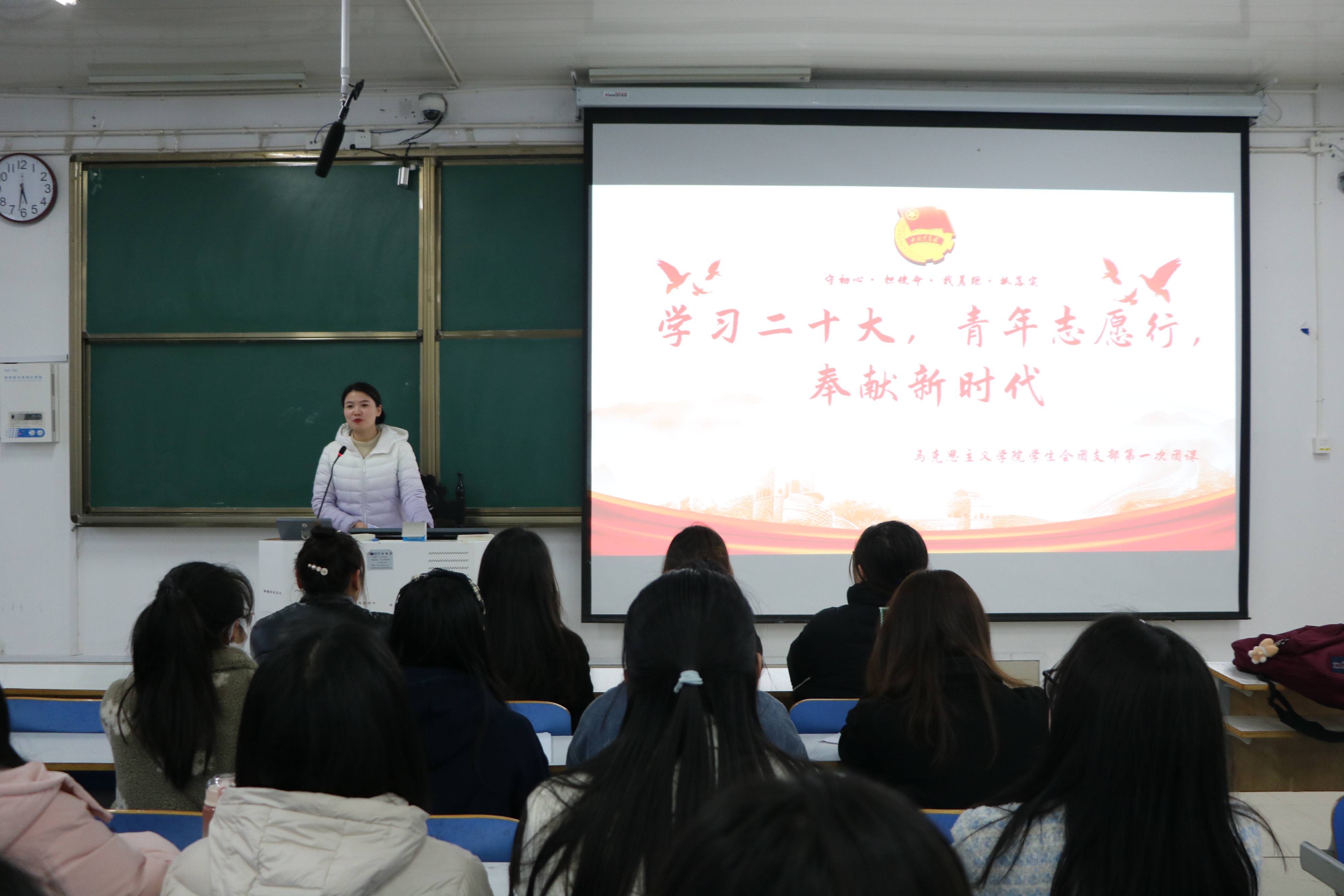 为深入学习贯彻党的二十大精神,鼓励青年积极参与志愿活动,3月22日下午,ok138cn太阳集团529在社科楼514教室开展以“学习二十大,青年志愿行,奉献新时代”为主题的学生会团支部第一次团课,团委书记陶青青和学生会团支部全体成员共同参加本次团课。团课由陶青青讲授。