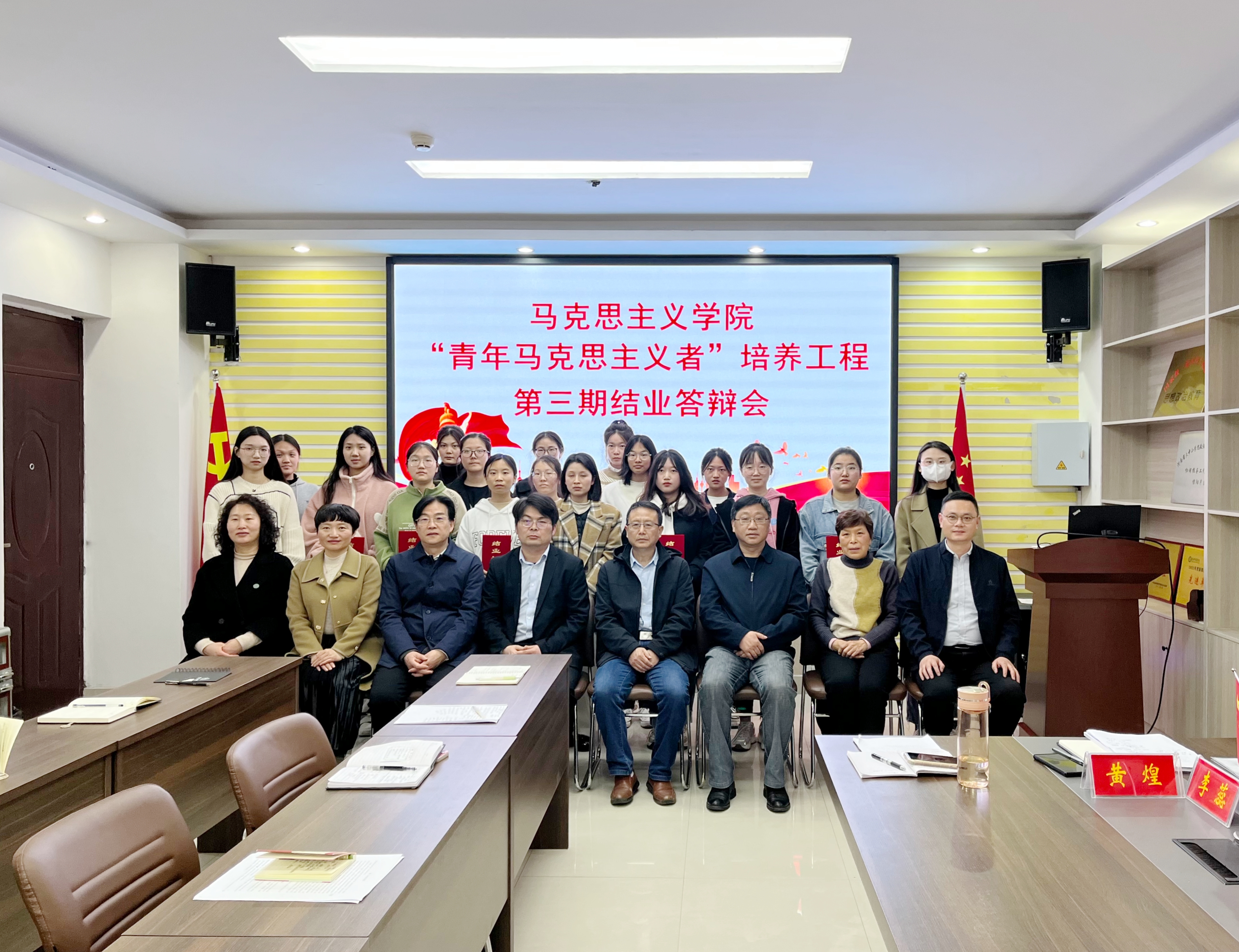 会上,黄煌介绍了答辩流程及安排。32员分四组派代表依次答辩汇报,答辩完成由答辩委员会进行提问。接着,学员分别向答辩委员会汇报了一年来理论学习、实践调研、开展宣讲、撰写论文等方面的心得体会。答辩委员认真听取汇报,并根据学员汇报情况、提交结业材料等,对学员进行随机提问。本次答辩过程既紧张严肃又热烈,学员们经过答辩委员的指导收获满满。评委们经过认真讨论,一致同意第三期“青年马克思主义者”培训工程32位学员通过结业答辩,顺利结业。并颁发了结业证书。